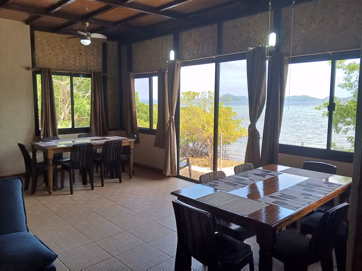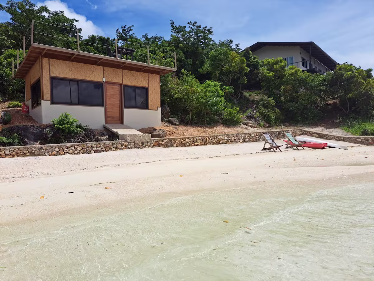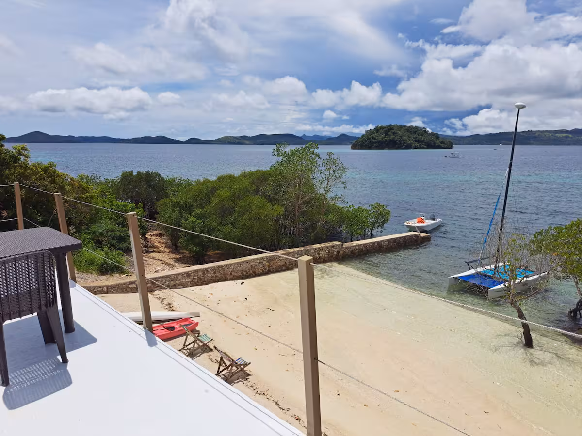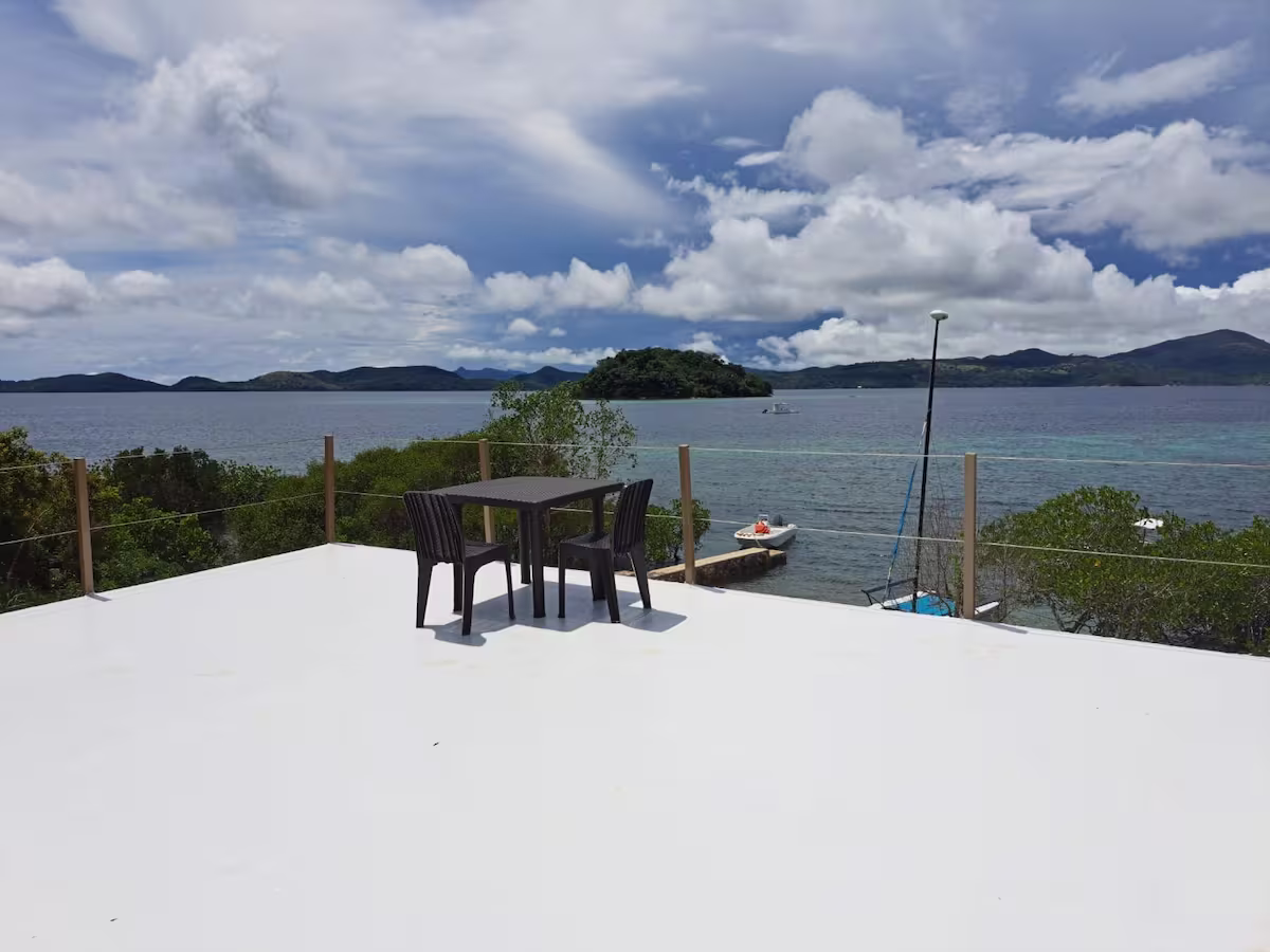 Villa with stunning overlooking sea views and large roof deck above. Enjoy the private beach, snorkeling on the reef, free kayaks, and fast Starlink satellite wifi. Island hopping and scuba diving and Hobie Cat available. Queen bed (and extra queen foam mattress on floor if needed), ensuite, kitchenette, dining table, ceiling fan, veranda. Meals available or cook your own. Easily accessible by boat from Coron. Private and peaceful and beautiful.