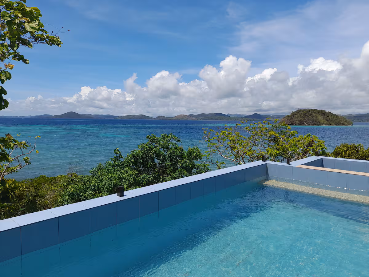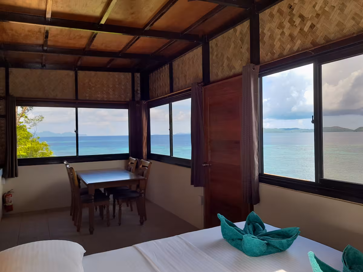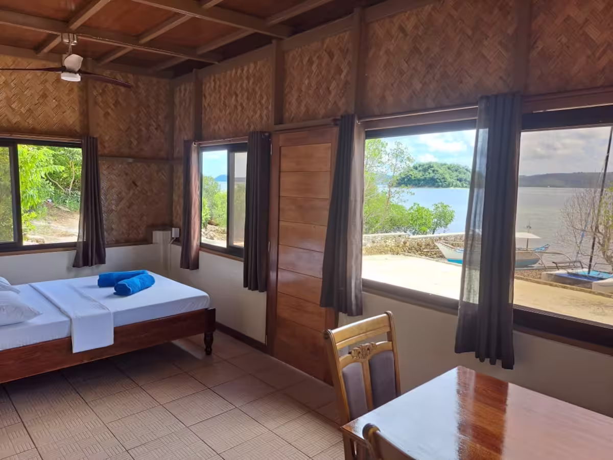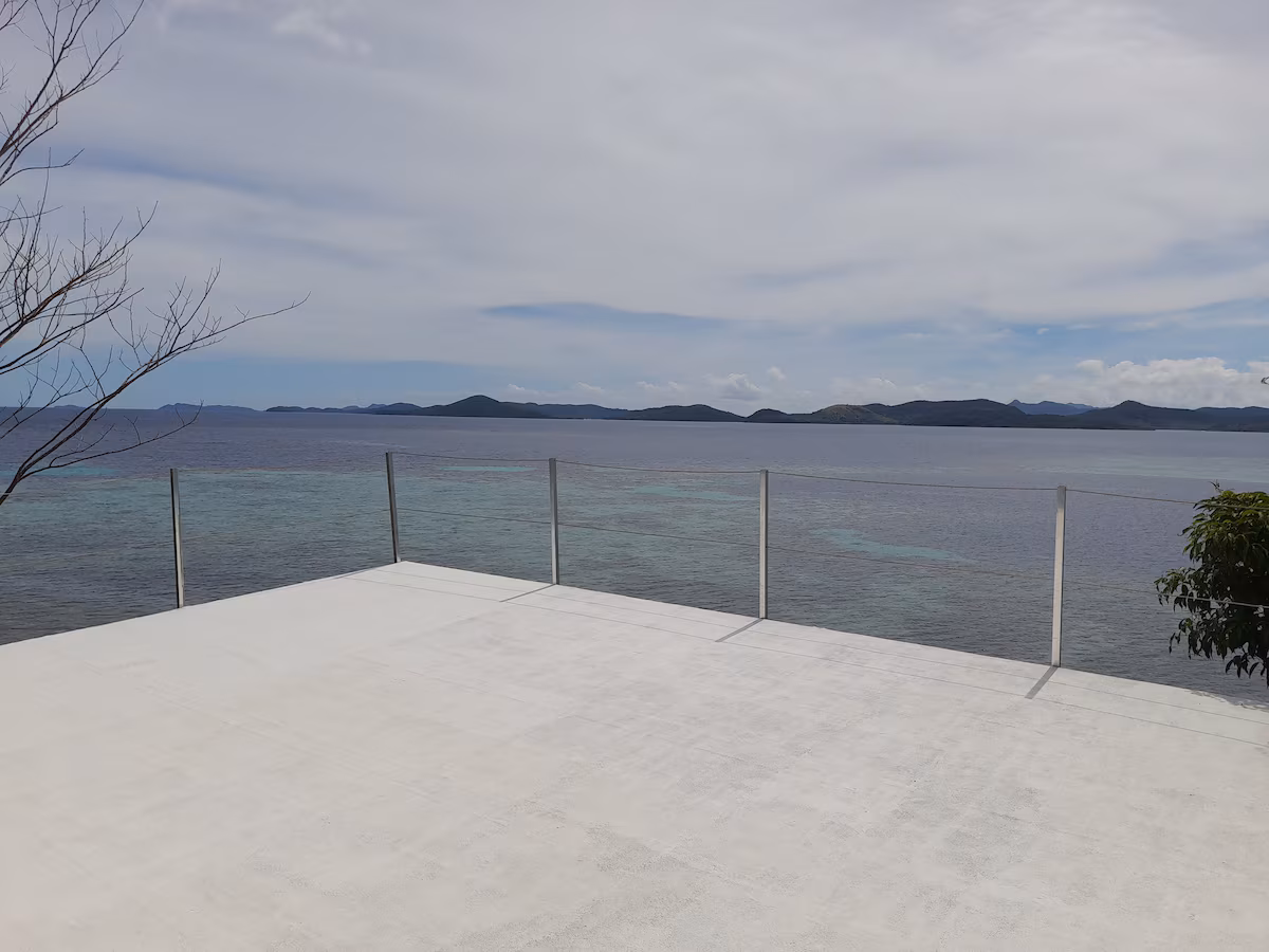 Villa with stunning overlooking sea views and large roof deck above. Enjoy the private beach, snorkeling on the reef, free kayaks, and fast Starlink satellite wifi. Island hopping and scuba diving and Hobie Cat available. Queen bed (and extra queen foam mattress on floor if needed), ensuite, kitchenette, dining table, ceiling fan, veranda. Meals available or cook your own. Easily accessible by boat from Coron. Private and peaceful and beautiful.