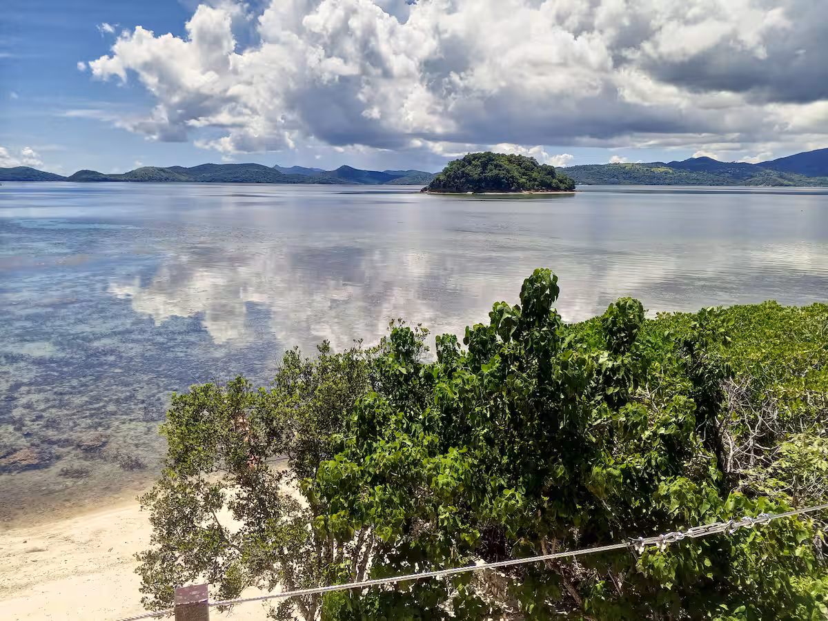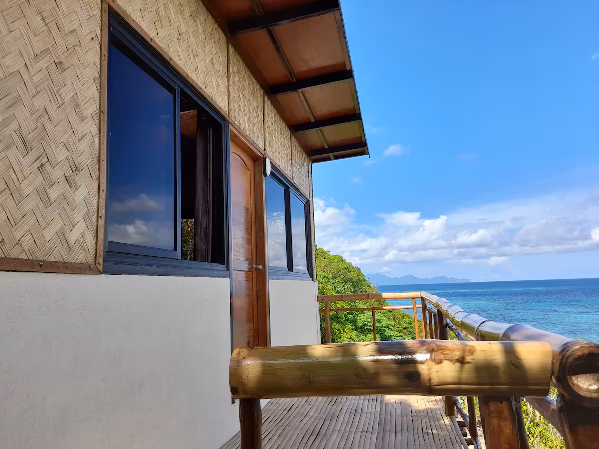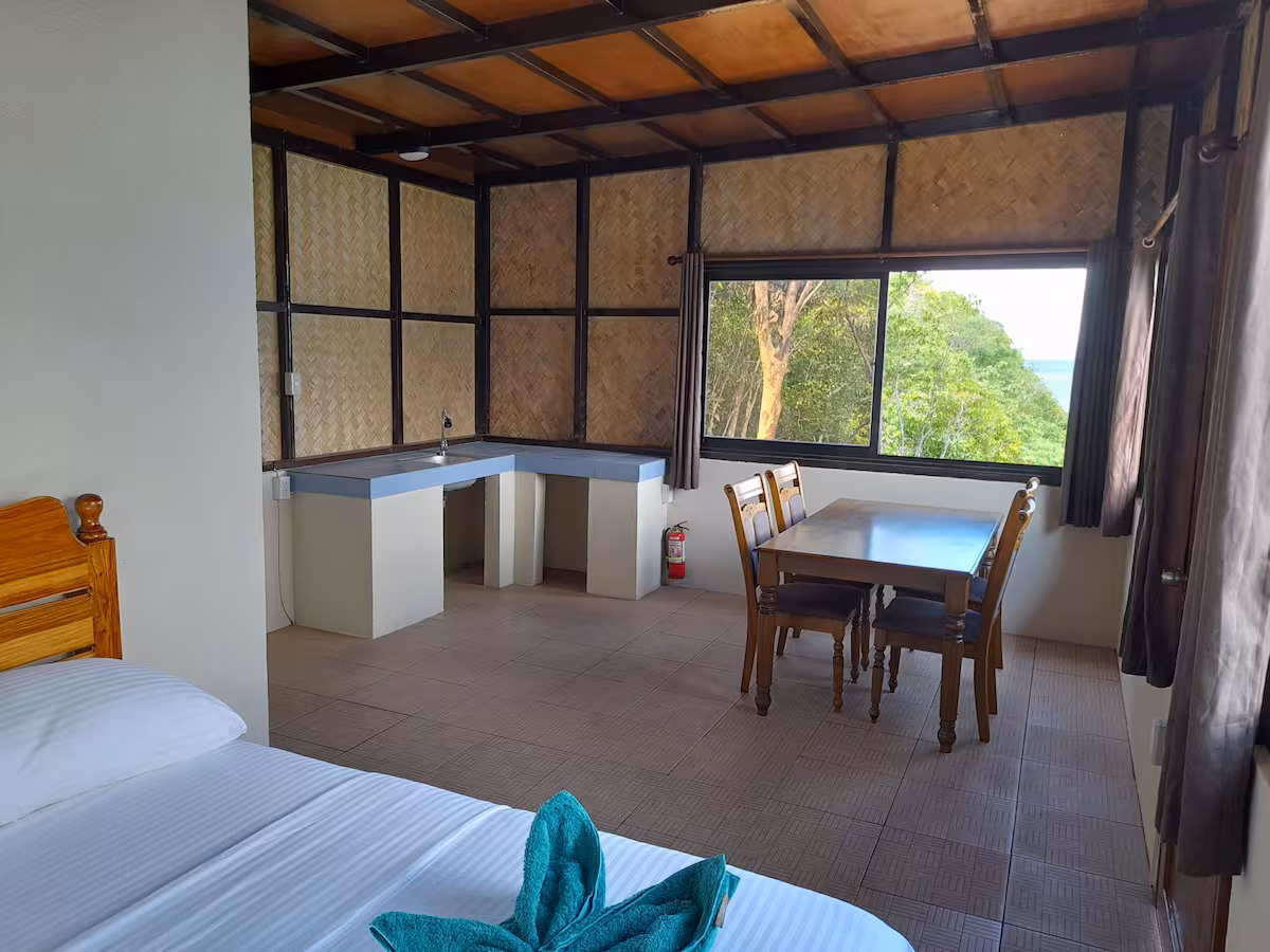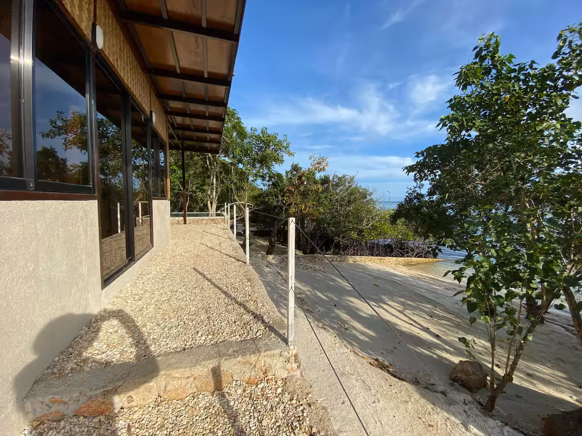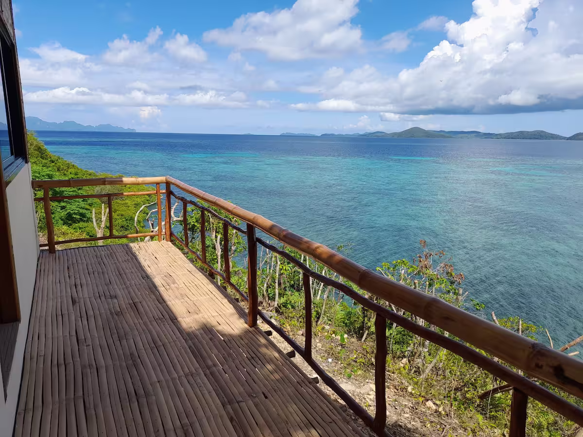 Sand Island Eco-Lodge’s cliff villa with stunning overlooking sea views and large roof deck above. Enjoy the private beach, snorkeling on the reef, free kayaks, and fast Starlink satellite wifi. Island hopping and scuba diving and Hobie Cat available. Queen bed (and extra queen foam mattress on floor if needed), ensuite, kitchenette, dining table, ceiling fan, veranda. Meals available or cook your own. Easily accessible by boat from Coron. Private and peaceful and beautiful.