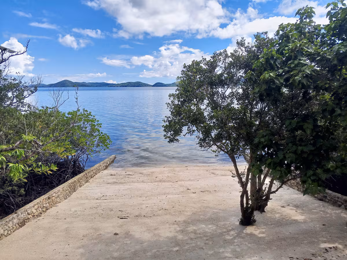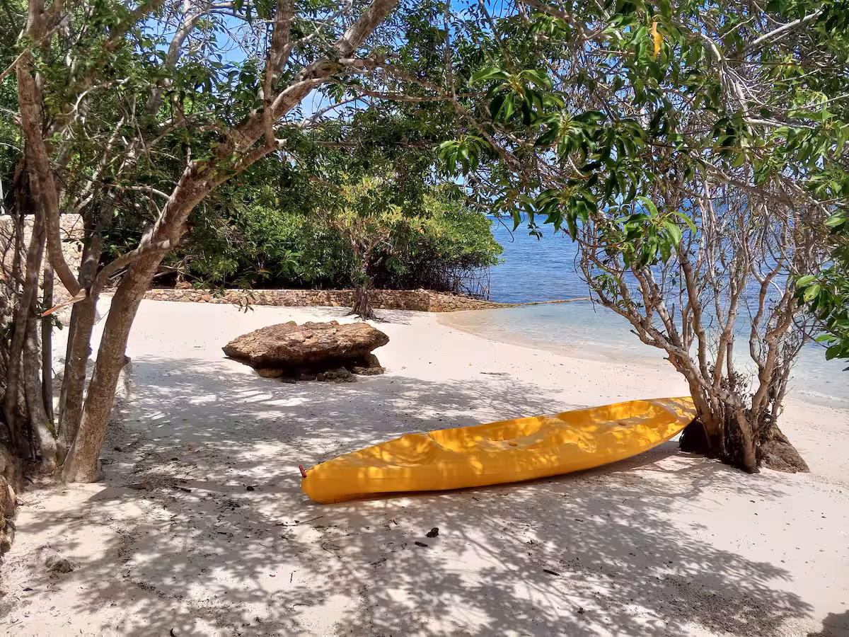 The beach is right outside your front door. Snorkel the reefs and enjoy free use of kayaks. Lounge on your spacious roof deck above to enjoy views of the islands and sunsets over the water. Fast Starlink satellite wifi, queen bed, ensuite, kitchenette, dining table, and ceiling fan. Extra foam mattress available to make a second bed.