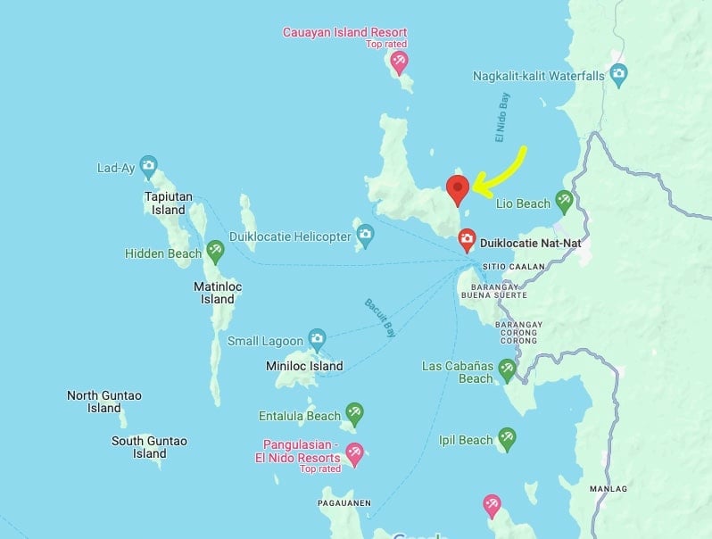 Nat-Nat Beach is located southeast of Cadlao Beach. It is an accessible 10-minute boat ride away from El Nido Town and is near Bukal Island. When booking a private tour, you can provide them with a list of islands and beaches that you want to visit before the tour.