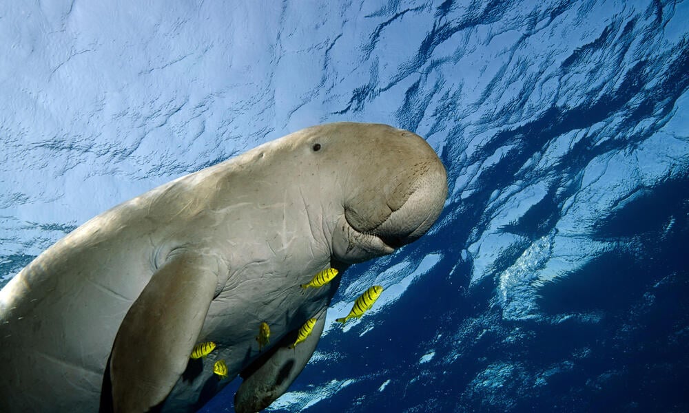 The dugong, or “sea cow,” is a large marine mammal that’s closely related to the manatee. Distinguished by its round snout and paddle-like flippers, this gentle herbivore spends its days grazing on seagrass in shallow coastal areas. Dugongs are an endangered species, and their population is particularly fragile due to habitat destruction, hunting, and limited reproductive rates. This makes responsible tourism and conservation efforts critical for their survival.