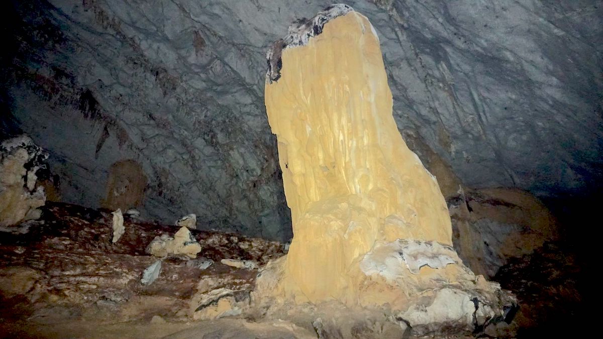 Stalagmite formations resembling human figures are bathed in warm light inside a dark cave, offering a mesmerizing sight on an underground river tour.