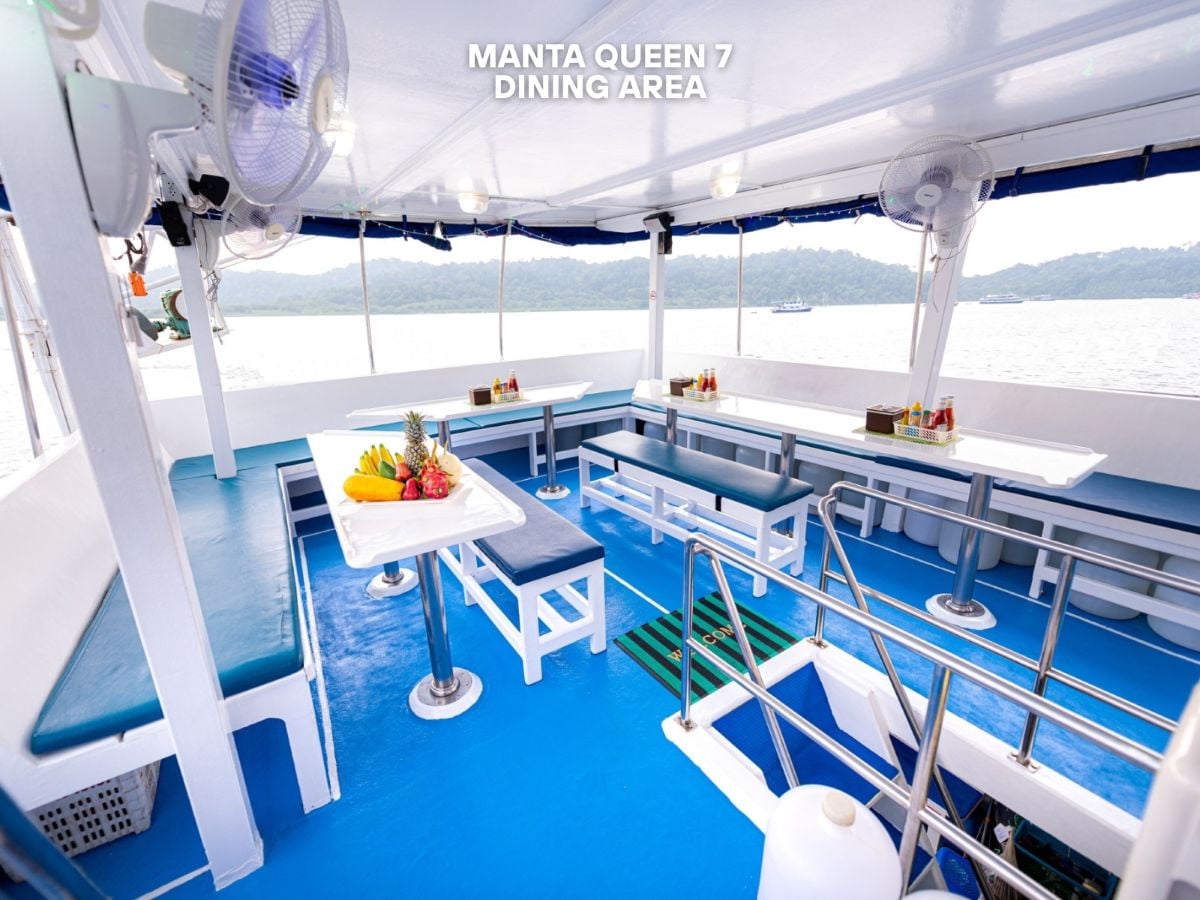 Manta Queen 1 provides a comfortable retreat after each thrilling dive. Enjoy amenities such as a cozy saloon and delicious onboard meals as you embark on an unforgettable diving adventure aboard Manta Queen 1.