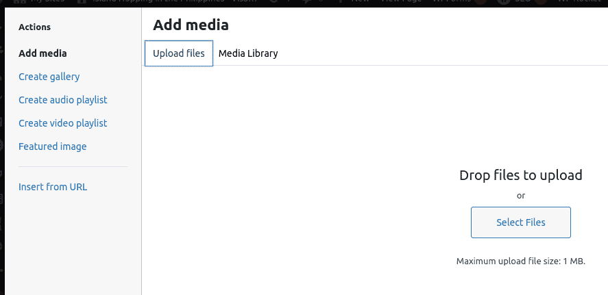 By default it is set to the Media Library tab near the top left, which is useful if you want to insert an image which we have already uploaded. But if not, don’t wait for those images to load but go ahead and press on the Upload Files tab, as shown in this screenshot above, and press the Select Files in the middle of the dialogue box.