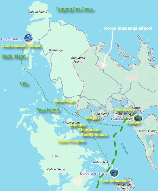 The area between Two Seasons and Resort1 is a beautiful, remote area but as such has only available simple accommodation (included in the price of the tour), such as beach huts or simple aircon hotel. If you prefer more comfort and to upgrade to fancier resorts, our boats are capable of making this distance in a single day (or to/from other fancy resorts in the Coron area).
