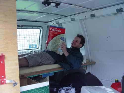 After communicating with several people, I was recommended to buy my vehicle in the US, if I planned to sell it later there before flying out of LA. Usually a painstaking process in itself, but fortunately for me (at least something is going smoothly), the neighbour of the friend I was staying at was trying to get rid of a van. A van he used to travel and live in himself. A van with built-in bed frame with mattress, a shelf system for my clothes, and a secondary, boat battery which can be drained to nill (unlike car batteries which should only be drained to about 80%), with all the necessary wiring to get going right away.