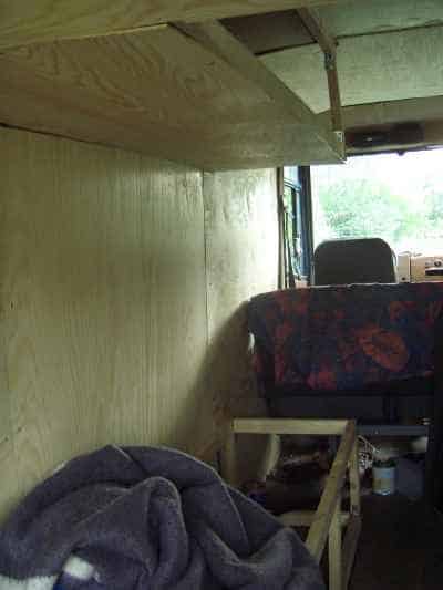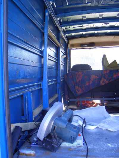 I bought some fake and also real leather, and just glued it on the ugly brown plastic dashboard. I have yet to glue on the red real leather to the steering wheel and the stick shift. I glued zirconium studs on the shift handle, but they have been knocked off since then. Will try again but with a see through layer of rubbery plastic. Cheese is the name of the game for the front cabin area, which I want to look like an ultra cheesy professional truck driver would choose – just for the joke of it all (and to help conceal the fact that there is a caravan home hiding in the back). A hanging blanket behind this front area now hides the back, if necessary. I still want to cheese up the front a lot more.