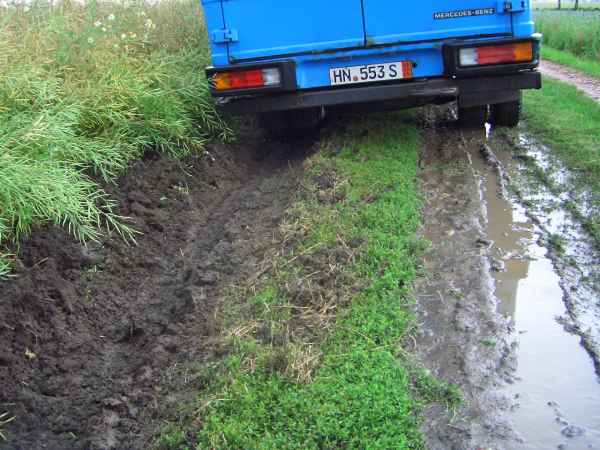 Here is a back view of how I got stuck in the mud as shown on the first page. Unfortunately, this older model’s back tires were not locked, one set would often spin on its own when things got a bit slippery. It helped a lot once the load became heavier.