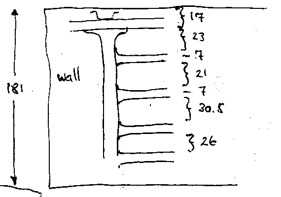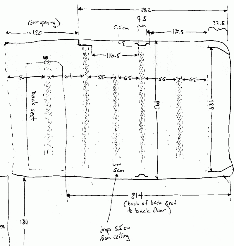 (the vertical fuzzy lines are the ribs on the ceiling – measurements in cm)