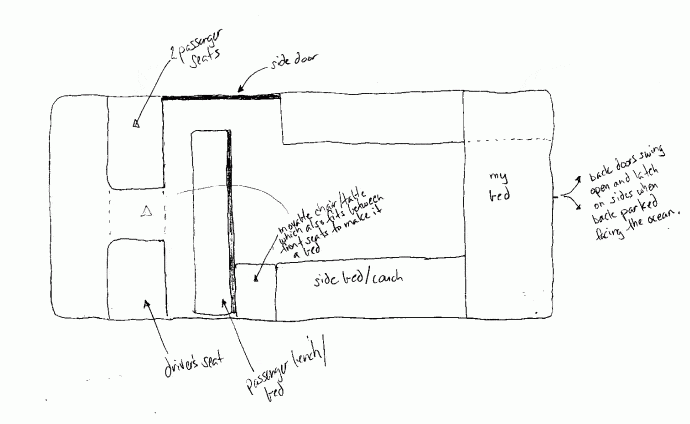 Here is the top view of my vision. A backpack or custom movable seat could be placed between the front two seats to create an extra bed. The second bench seat could also act as a bed. In all, there are enough seatbelts to hold seven passengers legally.