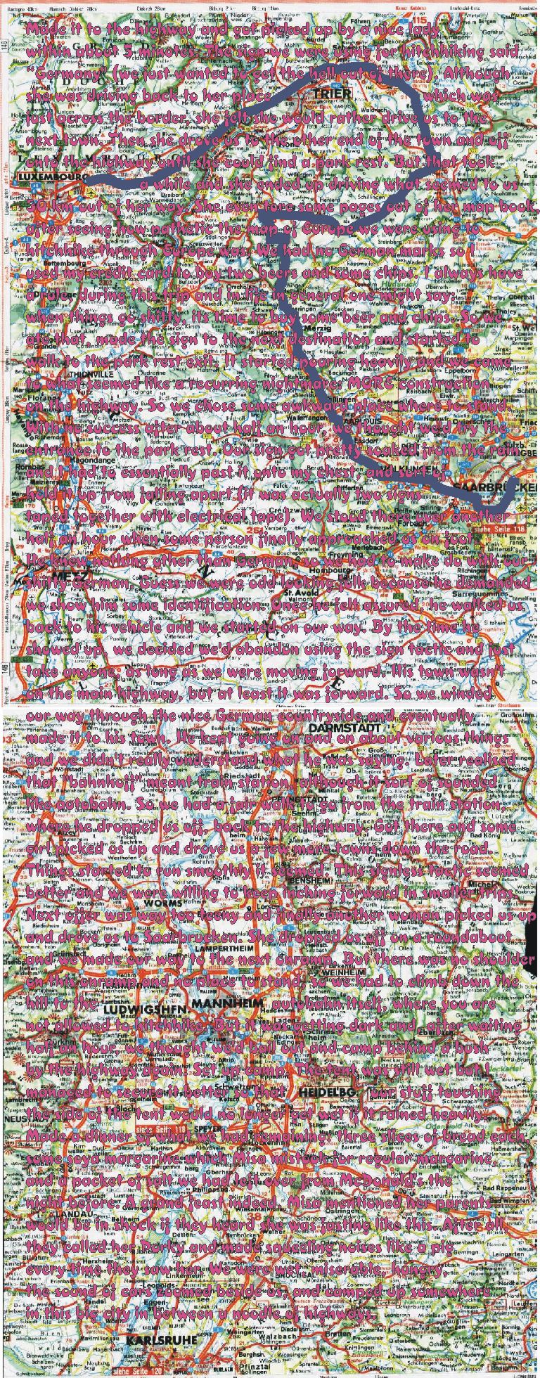 A different map, the map we started with, of the same section as above. Looked much more “innocent” than the closeup. Note also the minute distance we travelled for the whole day compared to our desired destination: Munich.